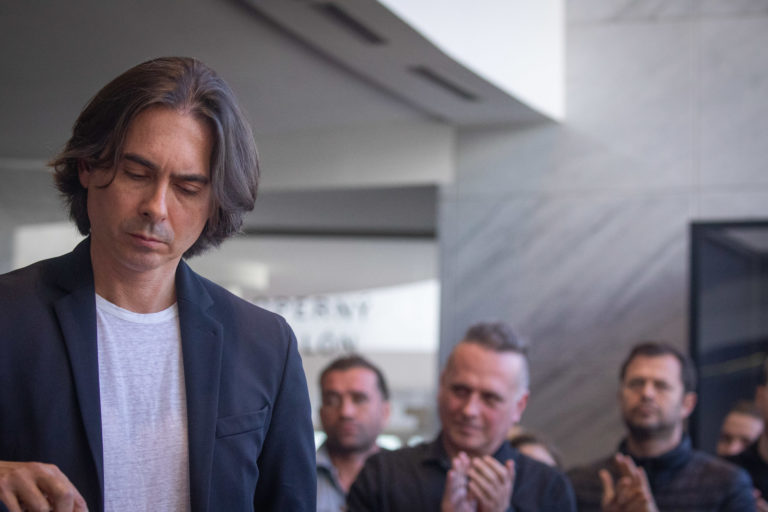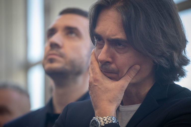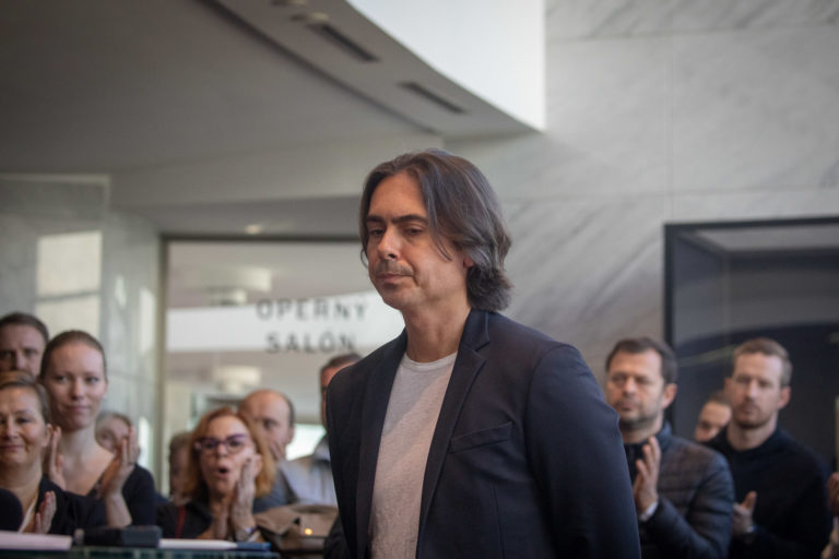 Odchádzajúci generálny riaditeľ Slovenského národného divadla (SND) Matej Drlička (v popredí) počas brífingu k jeho prijatiu demisie v priestoroch novej budovy SND. Ministerka kultúry SR Natália Milanová odvolala Drličku z funkcie k 1. novembru 2022 z dôvodu jeho výrokov na umelcov a politikov. Bratislava, 25. október 2022. Foto: SITA/Diana Černáková