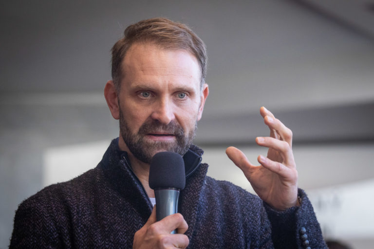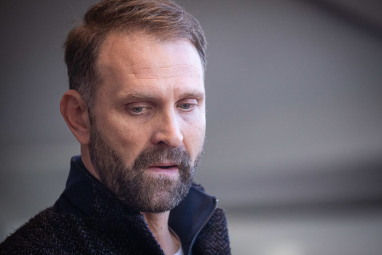 Herec Tomáš Maštalír počas brífingu k prijatiu demisie generálneho riaditeľa SND Mateja Drličku v priestoroch novej budovy SND. Ministerka kultúry SR Natália Milanová odvolala Drličku z funkcie k 1. novembru 2022 z dôvodu jeho výrokov na umelcov a politikov. Bratislava, 25. október 2022. Foto: SITA/Diana Černáková