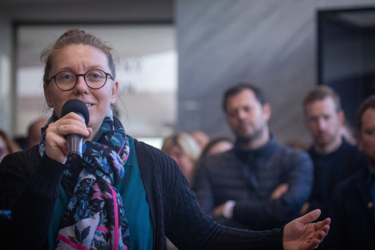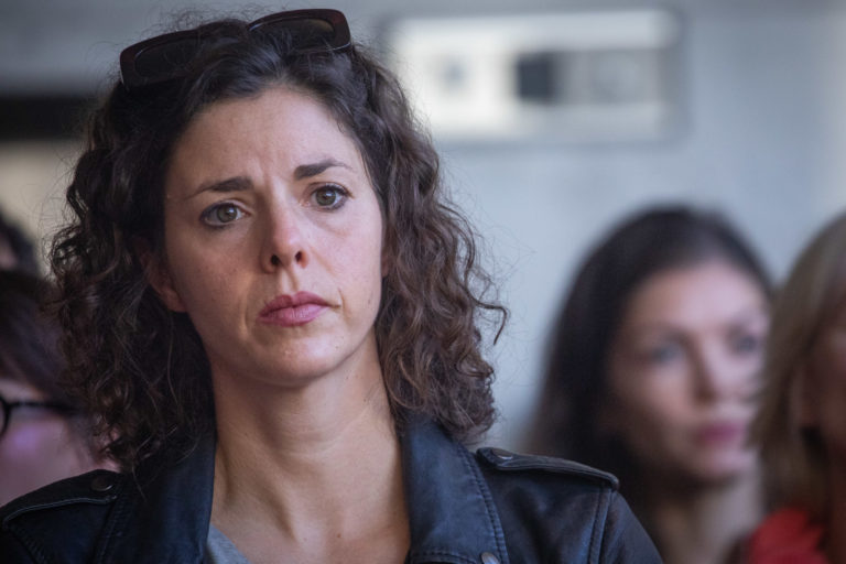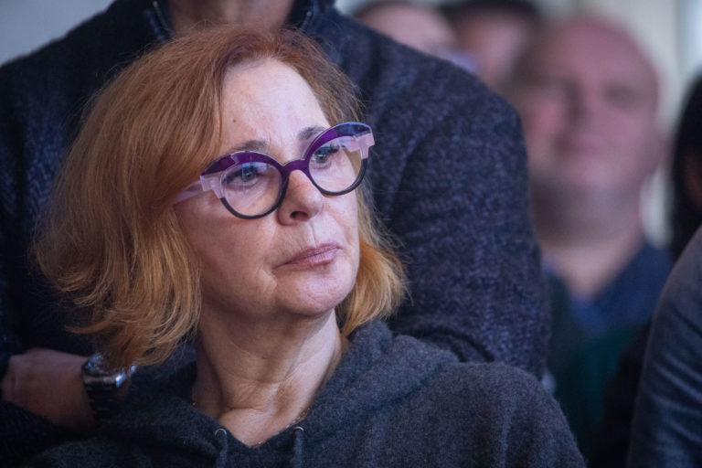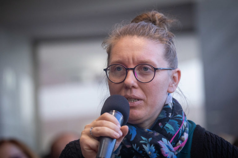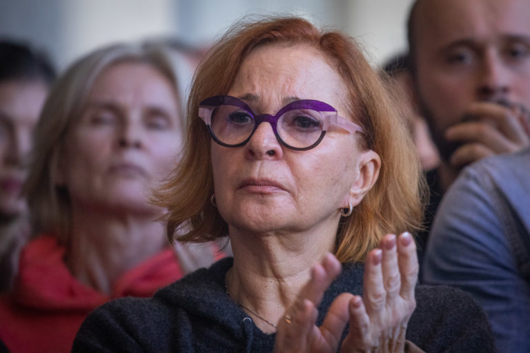 Herečka Kamila Magálová počas brífingu k prijatiu demisie generálneho riaditeľa SND Mateja Drličku v priestoroch novej budovy SND. Ministerka kultúry SR Natália Milanová odvolala Drličku z funkcie k 1. novembru 2022 z dôvodu jeho výrokov na umelcov a politikov. Bratislava, 25. október 2022. Foto: SITA/Diana Černáková