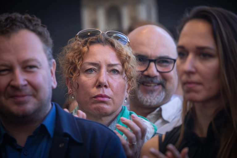 Herečka Gabriela Dzuríková (uprostred vľavo) počas brífingu k prijatiu demisie generálneho riaditeľa SND Mateja Drličku v priestoroch novej budovy SND. Ministerka kultúry SR Natália Milanová odvolala Drličku z funkcie k 1. novembru 2022 z dôvodu jeho výrokov na umelcov a politikov. Bratislava, 25. október 2022. Foto: SITA/Diana Černáková