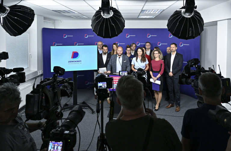 Zľava v popredí: Člen predsedníctva Demokratov Jaroslav Naď, kandidátka Demokratov Natália Svítková, líderka Demokratov Andrea Letanovská a člen predsedníctva Demokratov Juraj Šeliga počas brífingu strany Demokrati v ich centrále na tému: Vyjadrenie k útoku Róberta Fica na rodinu členky strany Demokrati a vyvrátenie jeho manipulácií a klamstiev. Bratislava, 16. september 2023. Foto: SITA/Milan Illík.