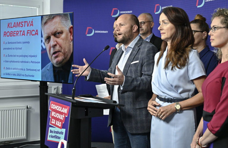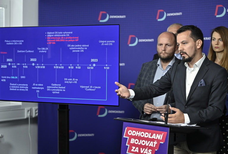 Brífing strany Demokrati v ich centrále na tému: Vyjadrenie k útoku Róberta Fica na rodinu členky strany Demokrati a vyvrátenie jeho manipulácií a klamstiev. Bratislava, 16. september 2023. Foto: SITA/Milan Illík.
