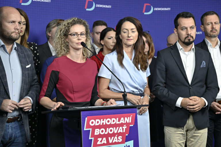 Zľava v popredí: Člen predsedníctva Demokratov Jaroslav Naď, líderka Demokratov Andrea Letanovská, kandidátka Demokratov Natália Svítková, člen predsedníctva Demokratov Juraj Šeliga. Foto: SITA/Milan Illík.