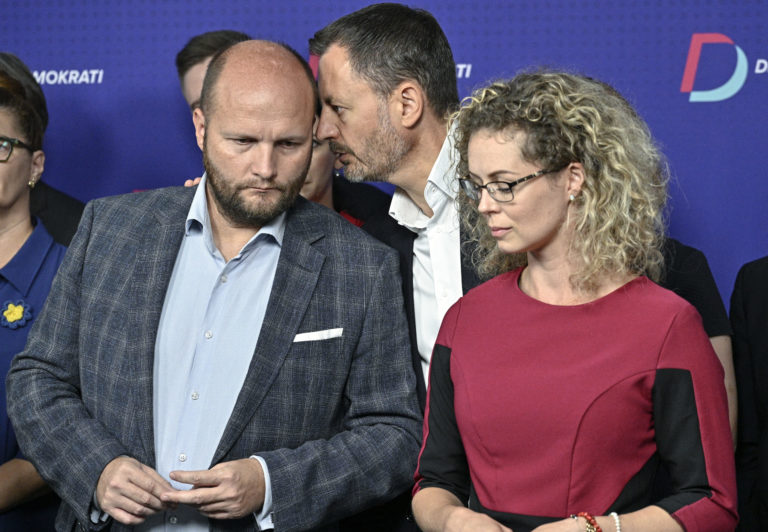 Zľava: Člen predsedníctva Demokratov Jaroslav Naď, predseda Demokratov Eduard Heger, kandidátka Demokratov Natália Svítková počas brífingu strany Demokrati v ich centrále na tému: Vyjadrenie k útoku Róberta Fica na rodinu členky strany Demokrati a vyvrátenie jeho manipulácií a klamstiev. Bratislava, 16. september 2023. Foto: SITA/Milan Illík.