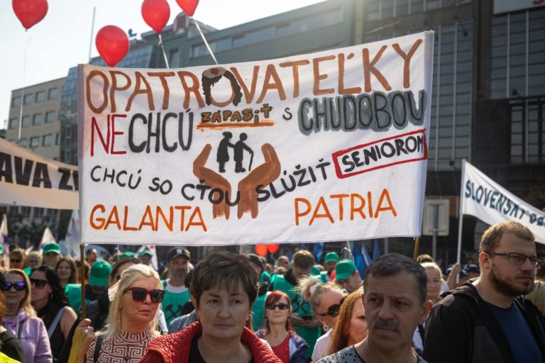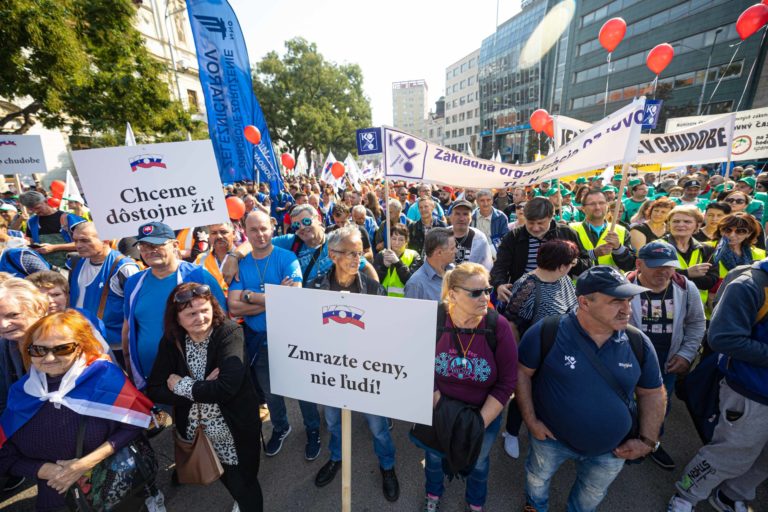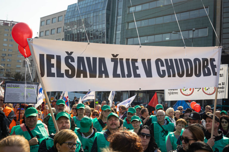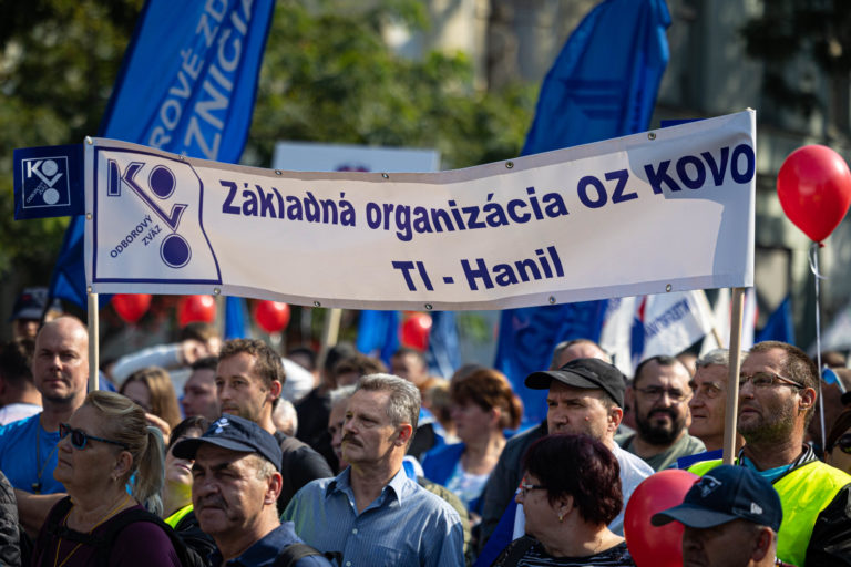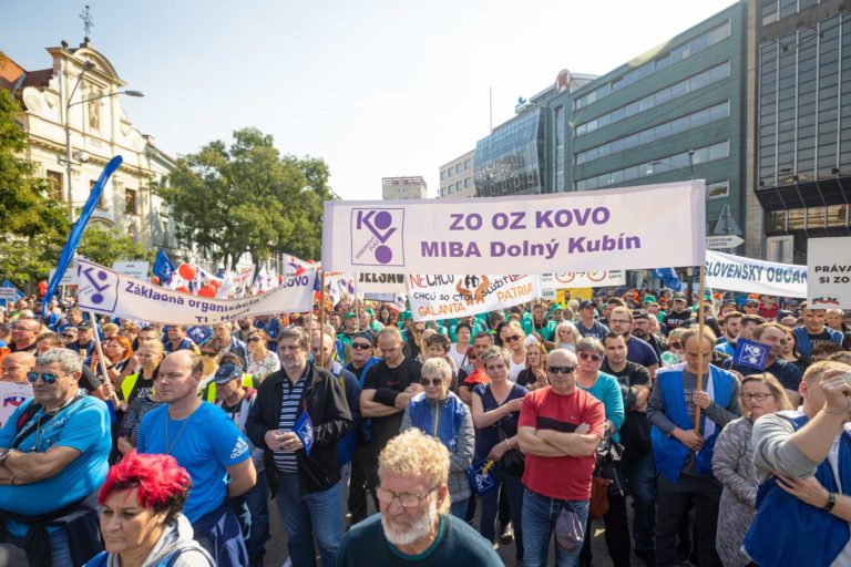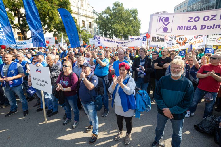 Účastníci počas demonštrácie Proti chudobe organizovanej Konfederáciou odborových zväzov (KOZ) SR na Námestí SNP v Bratislave. Foto: SITA/Jana Birošová