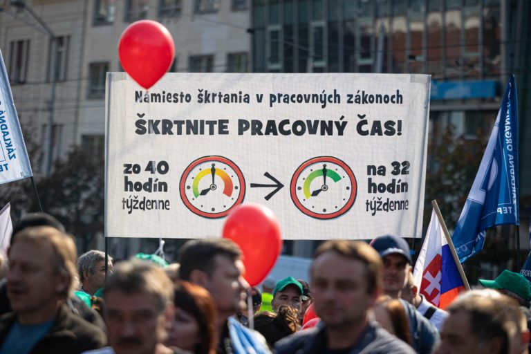 Účastníci počas demonštrácie Proti chudobe organizovanej Konfederáciou odborových zväzov (KOZ) SR na Námestí SNP v Bratislave. Foto: ilustračné, SITA/Jana Birošová