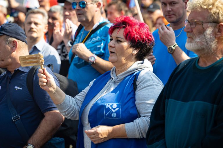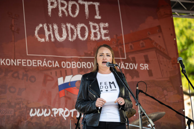 Prezidentka Konfederácie odborových zväzov (KOZ) SR Monika Uhlerová počas demonštrácie Proti chudobe organizovanej KOZ SR na Námestí SNP v Bratislave. Foto: SITA/Jana Birošová