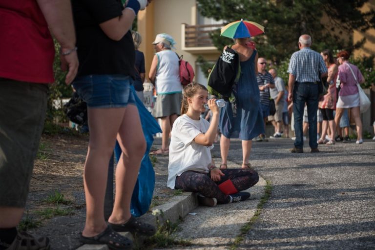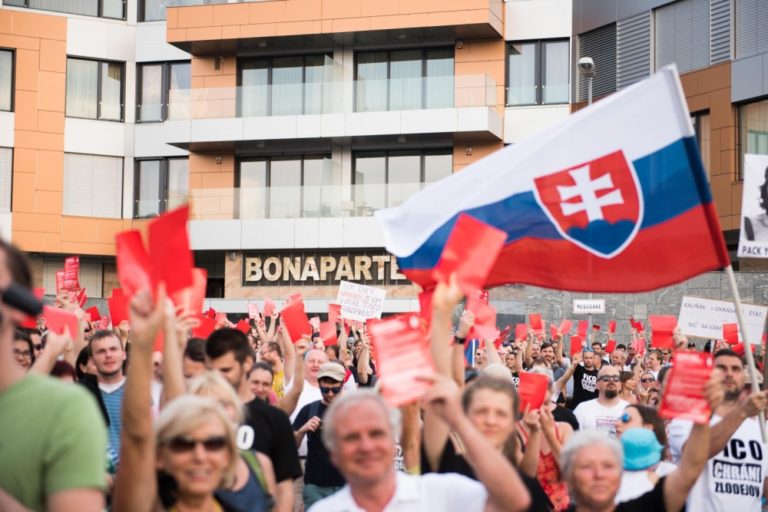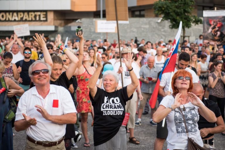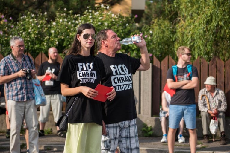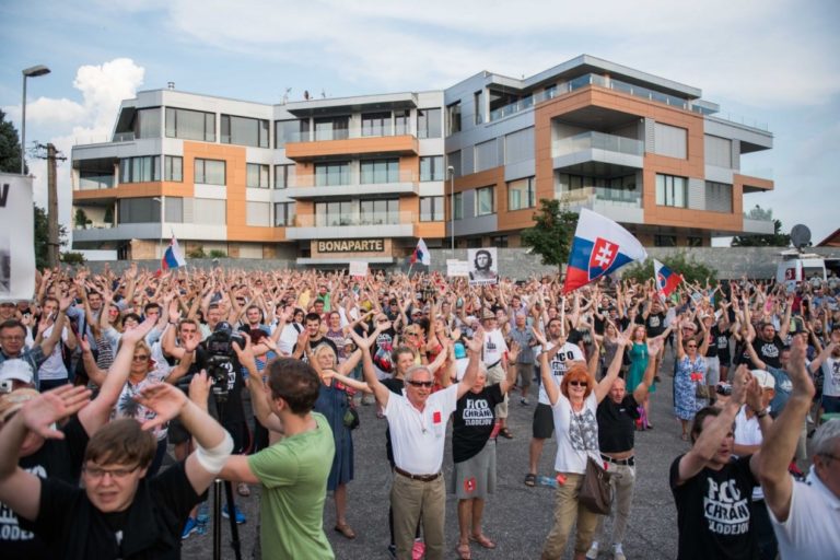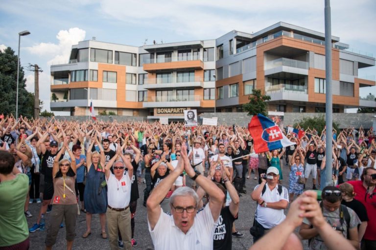 Účastníci protestu pred bytovým komplexom Bonaparte. Protest proti mafiánom vo vláde zorganizovali opozičné strany SaS a OĽaNO. Bratislava, 25. júl 2016. Foto: SITA/Monika Zaťková