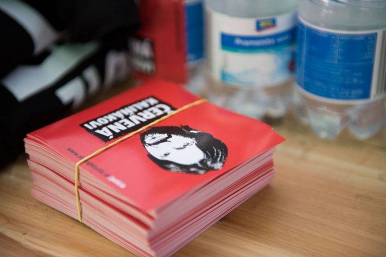 Pohľad na nálepky - Červená Kaliňákovi počas protestu pred bytovým komplexom Bonaparte. Protest proti mafiánom vo vláde zorganizovali opozičné strany SaS a OĽaNO. Bratislava, 25. júl 2016. Foto: SITA/Monika Zaťková