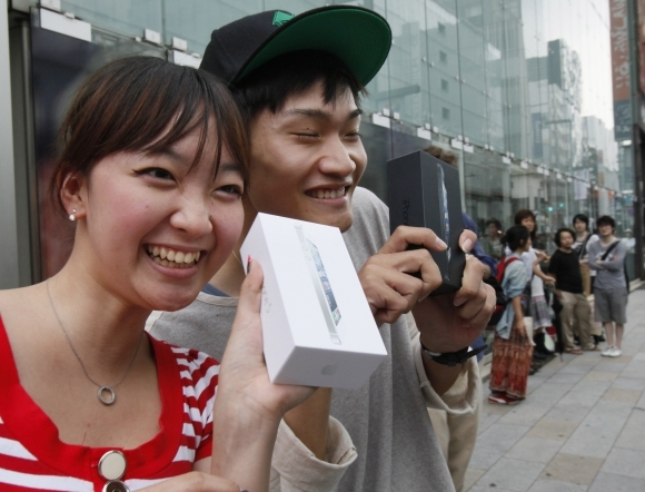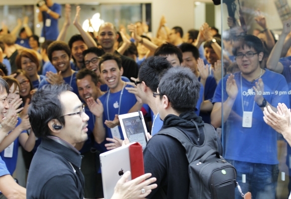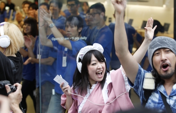 Zákazníci oslavujú otvorenie obchodu Apple v Tokiu. Foto: SITA/AP