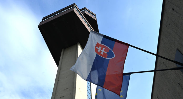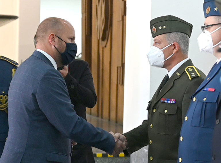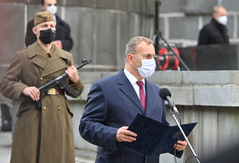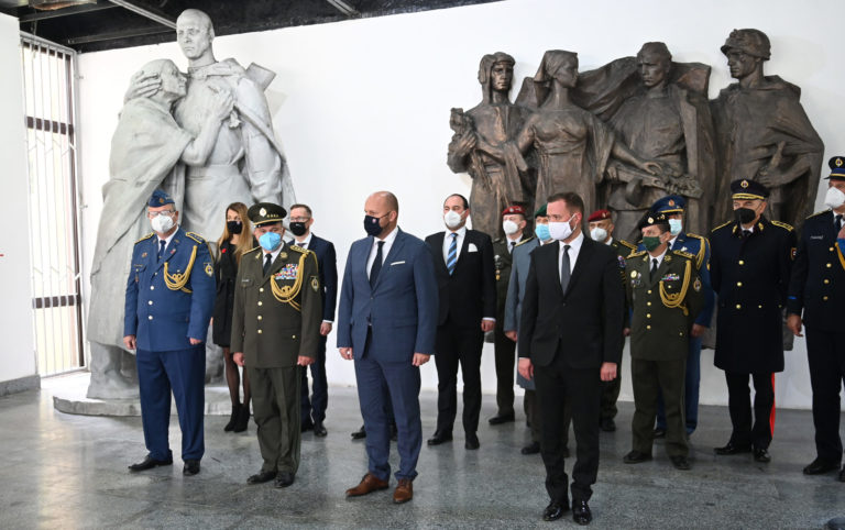 Zľava v popredí: Riaditeľ Vojenského historického ústavu (VHÚ) Miloslav Čaplovič, minister obrany SR Jaroslav Naď a náčelník Generálneho štábu OS SR Daniel Zmeko počas otvorenia zrekonštruovanej Vyhliadkovej veže na Dukle v okrese Svidník v rámci osláv Dňa hrdinov Karpatsko-duklianskej operácie. Vyšný Komárnik, 6. október 2021. Foto: SITA/Viktor Zamborský