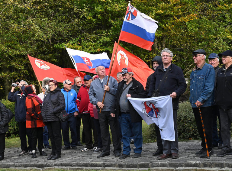 Účastníci počas osláv Dňa hrdinov Karpatsko-duklianskej operácie pri Pamätníku československého armádneho zboru na Dukle v okrese Svidník. Vyšný Komárnik, 6. október 2021. Foto: SITA/Viktor Zamborský