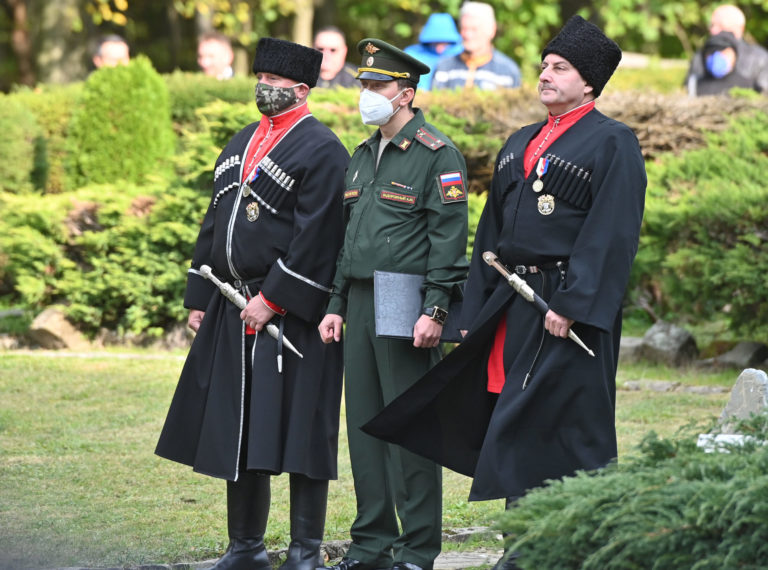 Účastníci počas pietneho aktu kladenia vencov k Pamätníku československého armádneho zboru na Dukle v okrese Svidník pri príležitosti osláv Dňa hrdinov Karpatsko-duklianskej operácie. Vyšný Komárnik, 6. október 2021. Foto: SITA/Viktor Zamborský