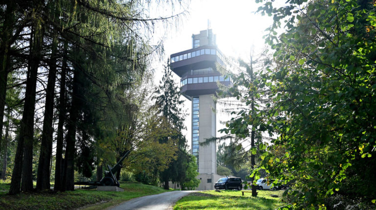 Zrekonštruovaná Vyhliadkova veža na Dukle v okrese Svidník počas jej otvorenia pri príležitosti osláv Dňa hrdinov Karpatsko-duklianskej operácie. Vyšný Komárnik, 6. október 2021. Foto: SITA/Viktor Zamborský