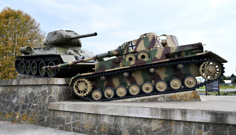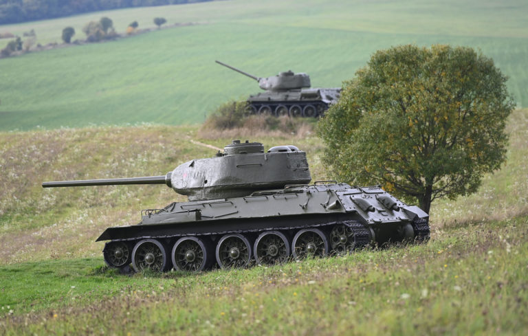 Historické tanky typu Stredný tank T-34/85 na území Údolia smrti v okrese Svidník počas osláv Dňa hrdinov Karpatsko-duklianskej operácie. Údolie smrti, 6. október 2021. Foto: SITA/Viktor Zamborský