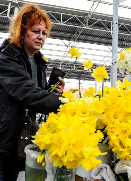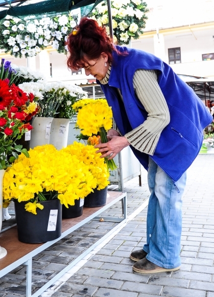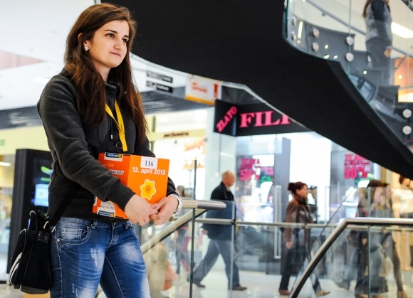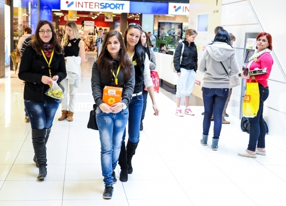Deň narcisov v nitrianskom nákupnom centre. Žltý narcis je symbolom nádeje pre tých, ktorí bojujú s onkologickým ochorením. Verejnoprospešnú finančnú zbierku každoročne organizuje Liga proti rakovine. Nitra, 12. apríl 2013. Foto: SITA/Martin Havran