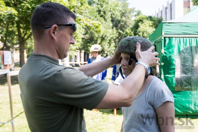 Návštevníčka si skúša vojenskú prilbu počas Dňa otvorených dverí na Úrade vlády SR. Bratislava, 7. jún 2014. Foto: SITA/Jozef Jakubčo