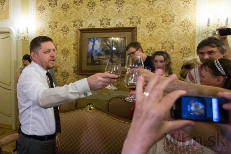 Predseda vlády SR Robert Fico (vľavo) si pripíja s návštevníkmi Úradu vlády SR počas Dňa otvorených dverí na Úrade vlády SR. Bratislava, 7. jún 2014. Foto: SITA/Jozef Jakubčo