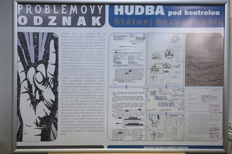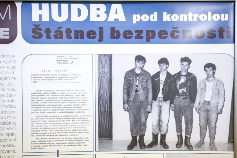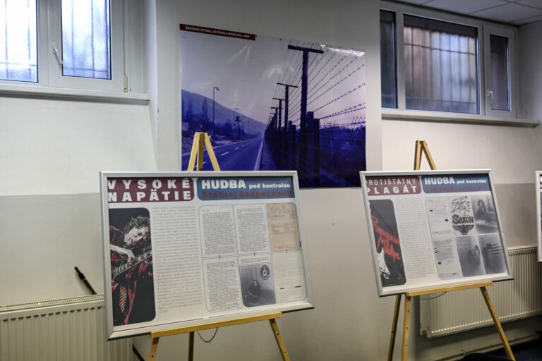 Plagát sprievodnej výstavy Hudba pod kontrolou Štátnej bezpečnosti (ŠtB) pri príležitosti Dňa otvorených dverí v Archíve Ústavu pamäti národa (ÚPN) v rámci Festivalu Slobody. Bratislava 12. november 2024. Foto: SITA/Milan Illík