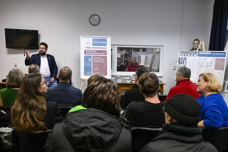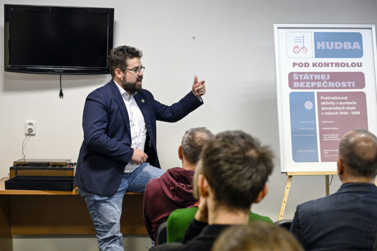 Riaditeľ archívu Ústavu pamäti národa (UPN) Peter Mikle (vľavo) počas prezentácie sprievodnej výstavy Hudba pod kontrolou Štátnej bezpečnosti (ŠtB) pri príležitosti Dňa otvorených dverí v Archíve Ústavu pamäti národa (ÚPN) v rámci Festivalu Slobody. Bratislava 12. november 2024. Foto: SITA/Milan Illík