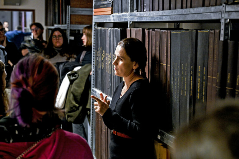 Vedúca oddelenia bádateľne Ingrid Tišliarová (vpravo) počas exkurzie pre študentov v rámci Dňa otvorených dverí v Archíve Ústavu pamäti národa (ÚPN) v rámci Festivalu Slobody. Bratislava 12. november 2024. Foto: SITA/Milan Illík