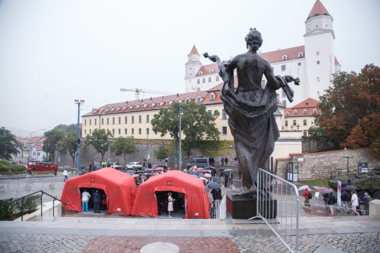 Pohľad na Bratislavský hrad a atmosféru pred parlamentom počas Dňa otvorených dverí (DOD) v Národnej rade SR pri príležitosti osláv 26. výročia prijatia Ústavy SR. Bratislava, 1. september 2018. Foto: SITA/Branislav Bibel