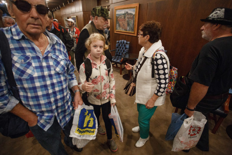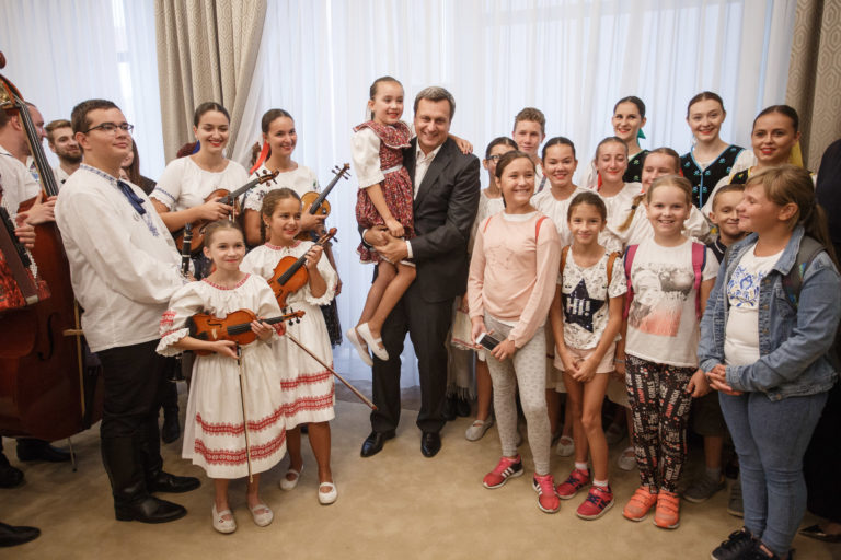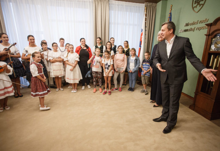Predseda NR SR Andrej Danko (uprostred) sa fotí s členmi folklórneho súboru a návštevníkmi parlamentu počas Dňa otvorených dverí (DOD) v Národnej rade SR pri príležitosti osláv 26. výročia prijatia Ústavy SR. Bratislava, 1. september 2018. Foto: SITA/Branislav Bibel