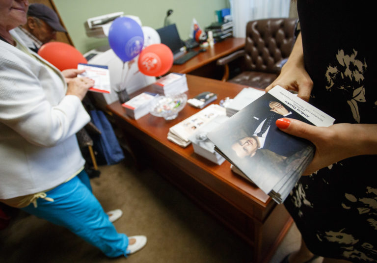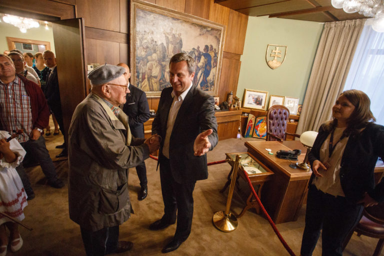 Predseda NR SR Andrej Danko (druhý sprava) sa zdraví s návštevníkmi Dňa otvorených dverí (DOD) v Národnej rade SR pri príležitosti osláv 26. výročia prijatia Ústavy SR. Bratislava, 1. september 2018. Foto: SITA/Branislav Bibel