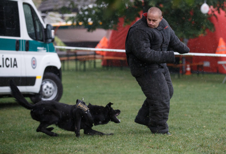 Prísluník polície zápasí s policajným psom v rámci prezentácie práce Policajného zboru SR na Bratislavskom hrade poèas osláv 26. výroèia prijatia Ústavy SR. Bratislava, 1. september 2018. Foto: SITA/Branislav Bibel Foto: SITA/Branislav Bibel