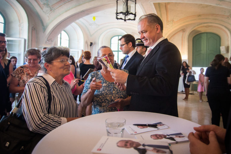 Prezident SR Andrej Kiska (vpravo) s návštevníkmi počas Dňa otvorených dverí (DOD) v Prezidentskom paláci pri príležitosti 3. výročia inaugurácie prezidenta Andreja Kisku. Bratislava, 15. jún 2017. Foto: SITA/Mako Erd