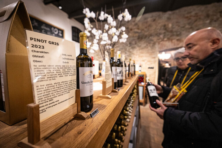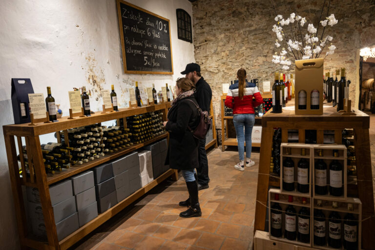 Návštevníci v Zámockom vinárstve v Pezinku počas 24. ročníka najväčšieho vinohradnícko - vinárskeho podujatia Deň otvorených pivníc 2024 v Malokarpatskom regióne od Bratislavy po Trnavu. Pezinok, 16. november 2024. Foto: SITA/Jana Birošová.
