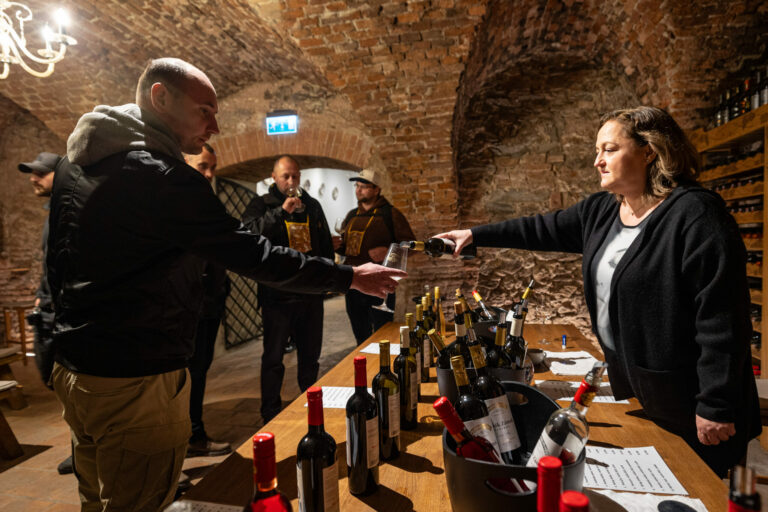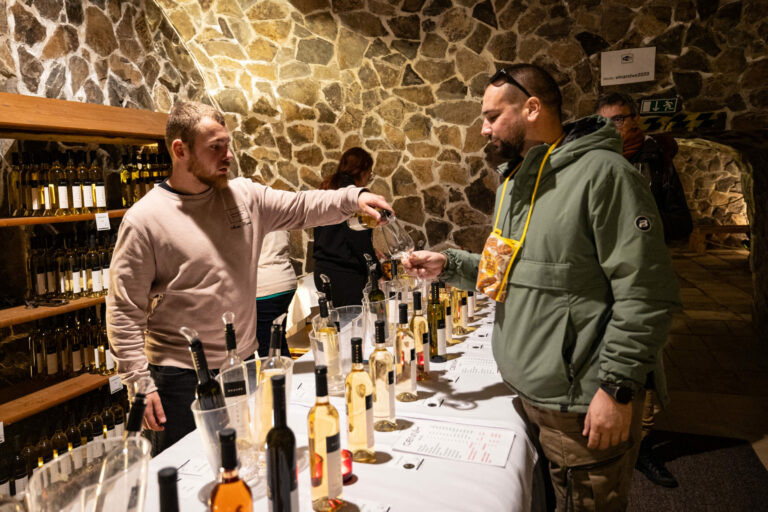 Ochutnávka vína v Zámockom vinárstve v Pezinku počas 24. ročníka najväčšieho vinohradnícko - vinárskeho podujatia Deň otvorených pivníc 2024 v Malokarpatskom regióne od Bratislavy po Trnavu. Pezinok, 16. november 2024. Foto: SITA/Jana Birošová.