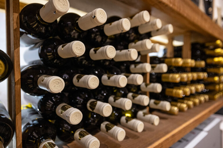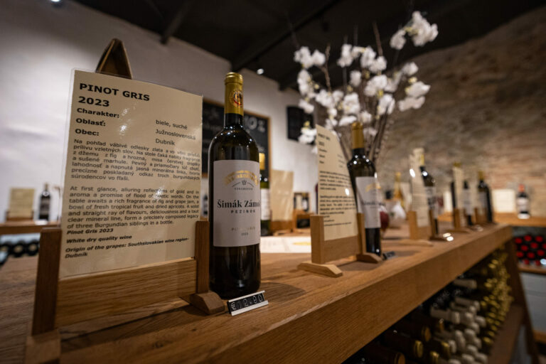 Fľaše s vínom v Zámockom vinárstve v Pezinku počas 24. ročníka najväčšieho vinohradnícko - vinárskeho podujatia Deň otvorených pivníc 2024 v Malokarpatskom regióne od Bratislavy po Trnavu. Pezinok, 16. november 2024. Foto: SITA/Jana Birošová.