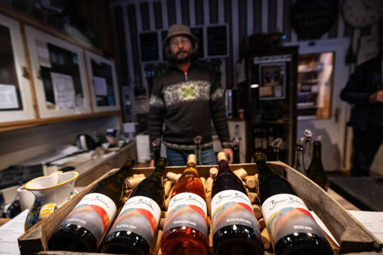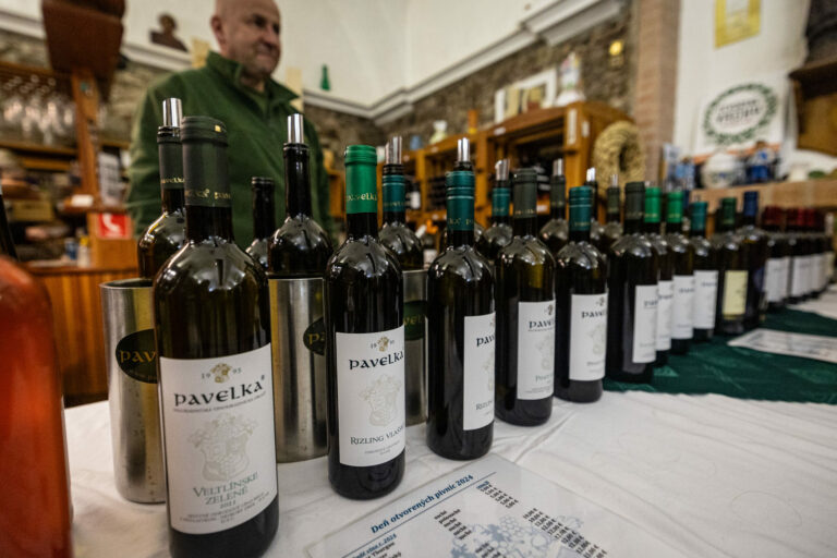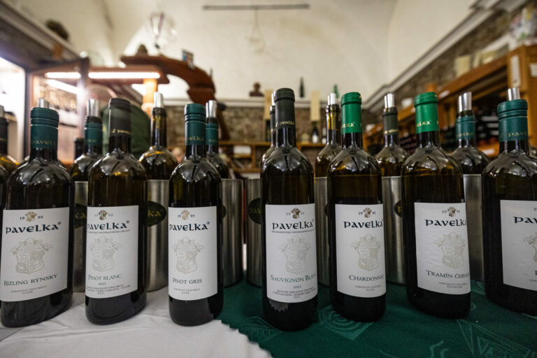 Fľaše s vínom z vinárstva Pavelka vo Farskej pivnici v Pezinku počas 24. ročníka najväčšieho vinohradnícko - vinárskeho podujatia Deň otvorených pivníc 2024 v Malokarpatskom regióne od Bratislavy po Trnavu. Pezinok, 16. november 2024. Foto: SITA/Jana Birošová.