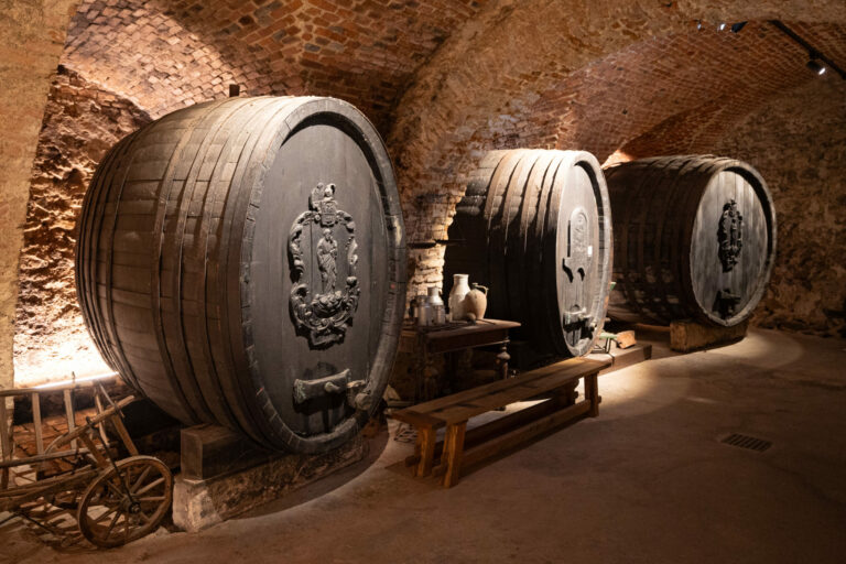 Drevené sudy na dozrievanie vína v Zámockom vinárstve v Pezinku počas 24. ročníka najväčšieho vinohradnícko - vinárskeho podujatia Deň otvorených pivníc 2024 v Malokarpatskom regióne od Bratislavy po Trnavu. Pezinok, 16. november 2024. Foto: SITA/Jana Birošová.