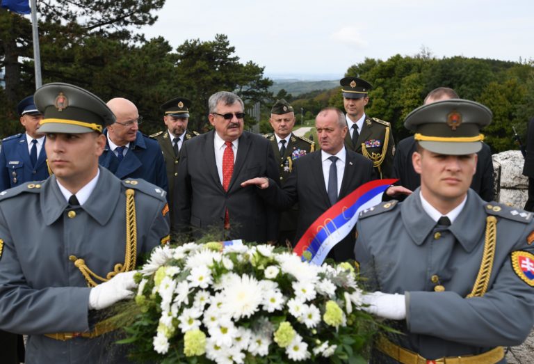 Sprava druhý rad: Minister obrany SR Peter Gajdoš, predseda Výboru NR SR pre obranu a bezpečnosť Anton Hrnko a generálny tajomník služobného úradu Ministerstva obrany SR Ján Hoľko počas pietneho aktu kladenia vencov k Mohyle M. R. Štefánika na Bradle počas osláv Dňa Ozbrojených síl SR pri príležitosti 25. výročia vzniku Slovenskej republiky. Brezová pod Bradlom, okr. Myjava, 22.september 2018 Foto: SITA/Martin Medňanský