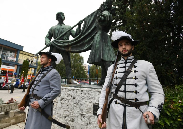 Vojaci v dobových uniformách pri pamätníku rokov 1848-49 počas osláv Dňa Ozbrojených síl SR pri príležitosti 25. výročia vzniku Slovenskej republiky. Brezová pod Bradlom, okr. Myjava, 22. september 2018. Foto: SITA/Martin Medňanský