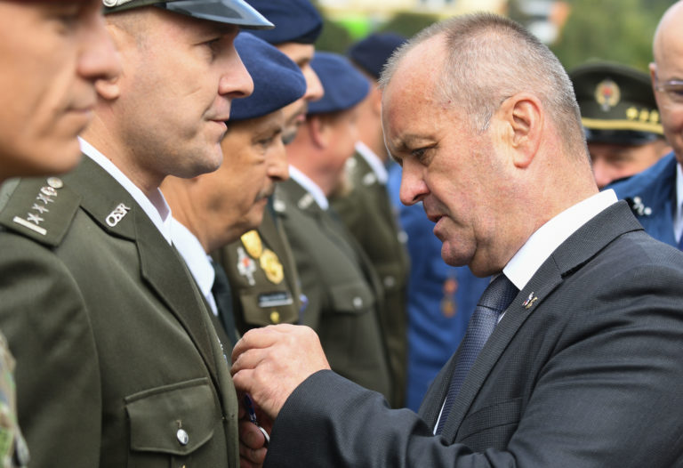 Minister obrany SR Peter Gajdoš (vpravo) počas oceňovania príslušníkov OSSR na námestí v Brezovej pod Bradlom počas osláv Dňa Ozbrojených síl SR pri príležitosti 25. výročia vzniku Slovenskej republiky. Brezová pod Bradlom, okr. Myjava, 22. september 2018. Foto: SITA/Martin Medňanský