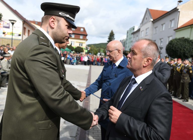 Sprava v popredí: Minister obrany SR Peter Gajdoš a vojak Matej Macho počas odovzdávania ocenenia za zranenie v boji na námestí v Brezovej pod Bradlom počas osláv Dňa Ozbrojených síl SR pri príležitosti 25. výročia vzniku Slovenskej republiky. Brezová pod Bradlom, okr. Myjava, 22. september 2018. Foto: SITA/Martin Medňanský