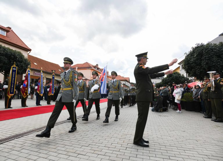 Minister obrany SR Peter Gajdoš (uprostred) a náčelník Generálneho štábu Ozbrojených síl SR Daniel Zmeko (vľavo) pri slávnostnom nástupe jednotiek OS SR na námestí v Brezovej pod Bradlom počas osláv Dňa Ozbrojených síl SR pri príležitosti 25. výročia vzniku Slovenskej republiky. Brezová pod Bradlom, okr. Myjava, 22. september 2018. Foto: SITA/Martin Medňanský