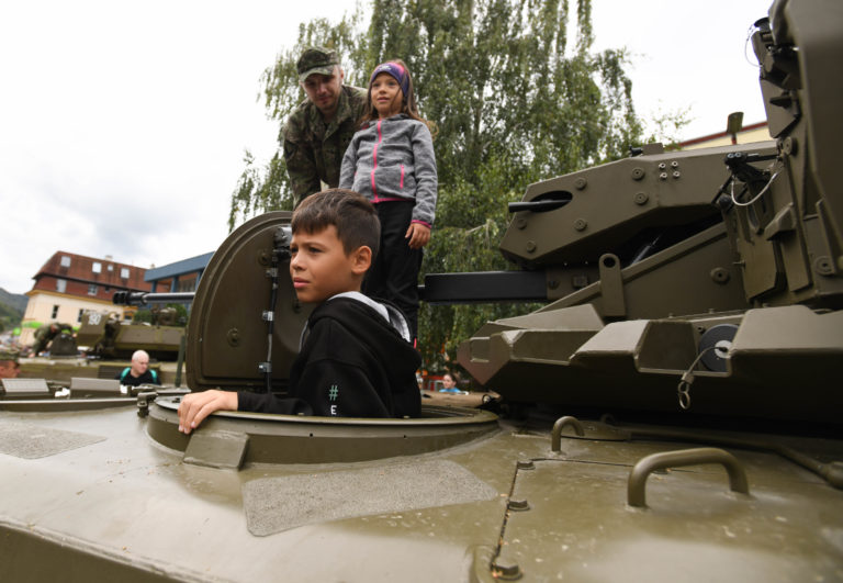 Návštevníci si prezerajú vojenské bojové prieskumné vozidlo Istar-BPsV-I počas osláv Dňa Ozbrojených síl SR pri príležitosti 25. výročia vzniku Slovenskej republiky. Brezová pod Bradlom, okr. Myjava, 22. september 2018. Foto: SITA/Martin Medňanský