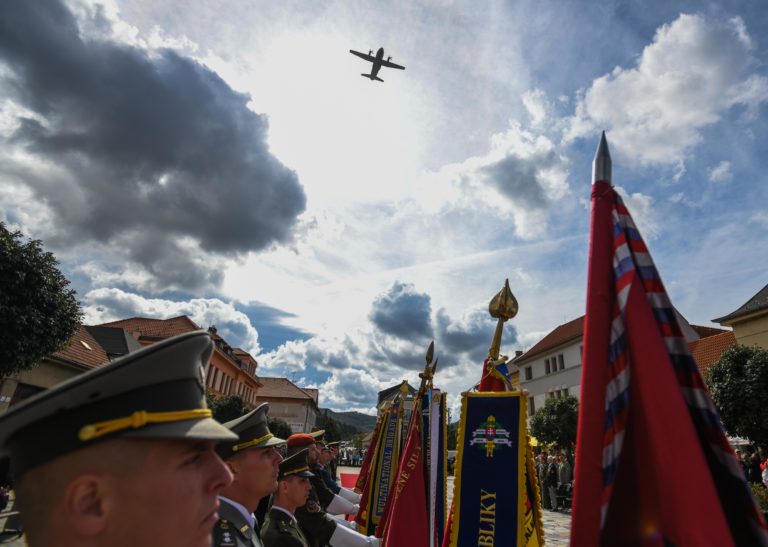 Prelet vojenského lietadla C-27 J Spartan ponad námestie v Brezovej pod Bradlom počas osláv Dňa Ozbrojených síl SR pri príležitosti 25. výročia vzniku Slovenskej republiky. Brezová pod Bradlom, okr. Myjava, 22. september 2018. Foto: SITA/Martin Medňanský