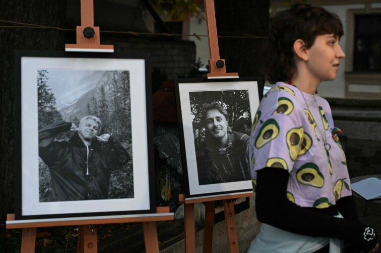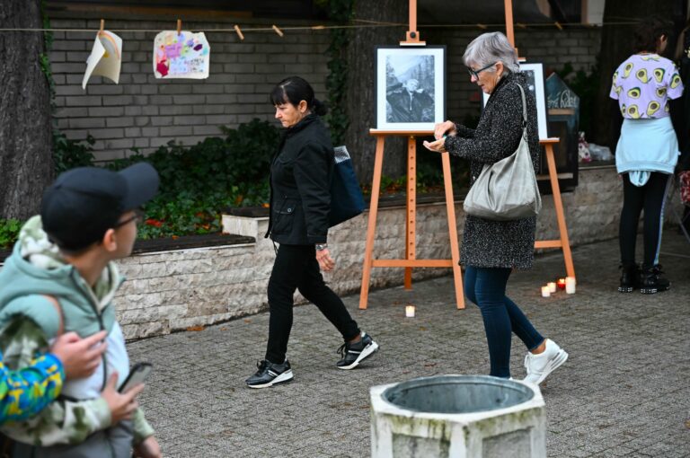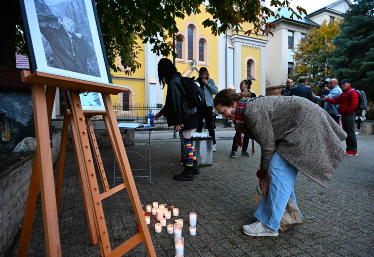 Atmosféra na Námestí študentov v blízkosti Gymnázia Ľudovíta Štúra v Trenčíne, kde si ľudia pripomenuli druhé výročie zavraždených dvoch mladých ľudí, Juraja Vankuliča a Matúša Horvátha pietnou spomienkou pod názvom Deň pestrosti. Trenčín, 11. október 2024. Foto: SITA/Tomáš Somr