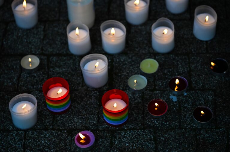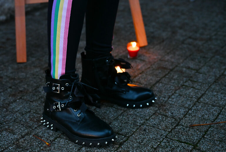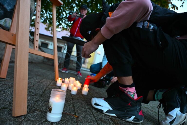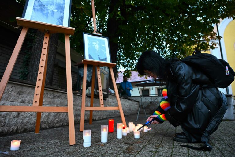 Zapálené kahance horia na Námestí študentov v blízkosti Gymnázia Ľudovíta Štúra v Trenčíne, kde si ľudia pripomenuli druhé výročie zavraždených dvoch mladých ľudí, Juraja Vankuliča a Matúša Horvátha počas pietnej spomienky pod názvom Deň pestrosti. Trenčín, 11. október 2024. Foto: SITA/Tomáš Somr