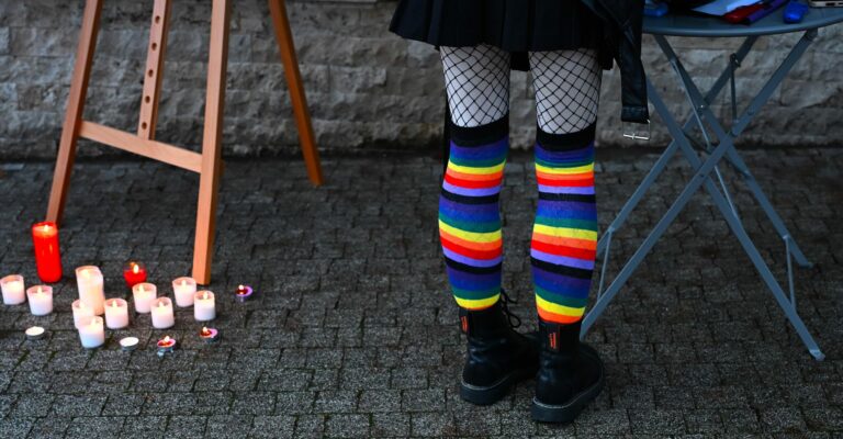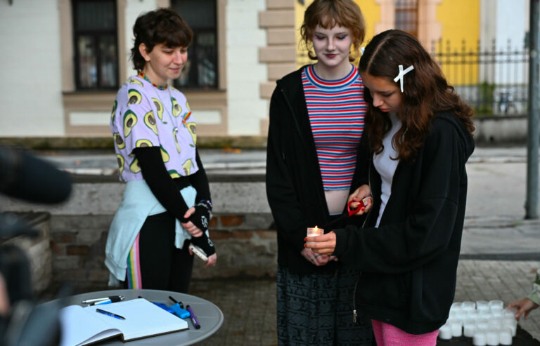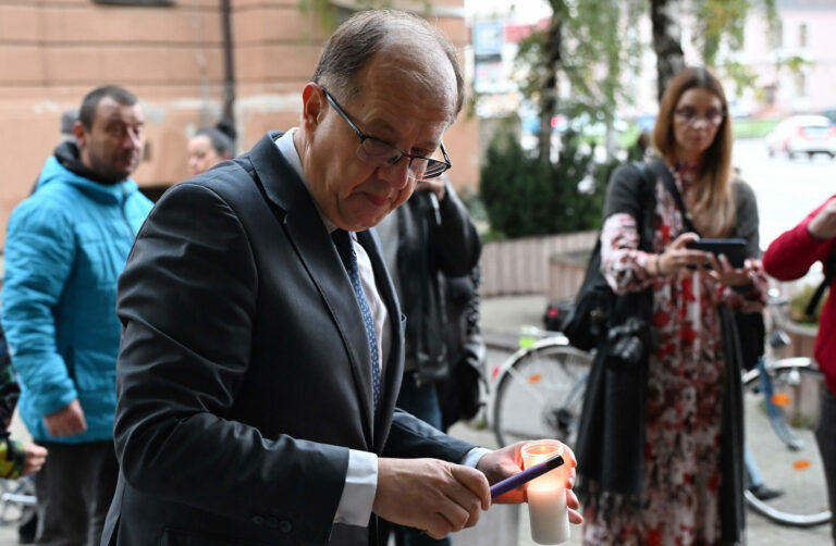 Primátor mesta Trenčín Richard Rybníček (v popredí) si prišiel úctiť zapálením sviečky druhé výročie zavraždenia dvoch mladých ľudí, Juraja Vankuliča a Matúša Horvátha pod názvom Deň pestrosti na Námestí študentov v blízkosti Gymnázia Ľudovíta Štúra v Trenčíne. Trenčín, 11. október 2024. Foto: SITA/Tomáš Somr