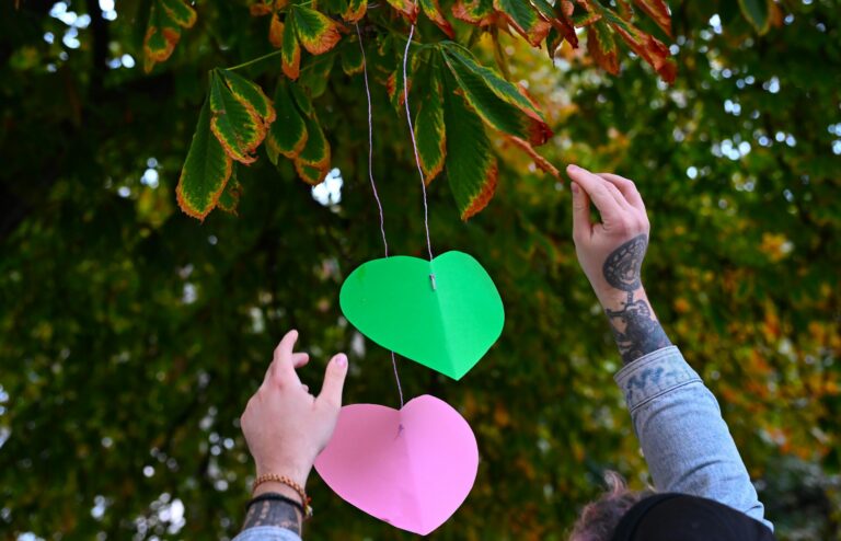 Farebné papierové srdcia visia na strome na Námestí študentov v blízkosti Gymnázia Ľudovíta Štúra v Trenčíne počas pietnej spomienky na druhé výročie zavraždených dvoch mladých ľudí, Juraja Vankuliča a Matúša Horvátha pod názvom Deň pestrosti. Trenčín, 11. október 2024. Foto: SITA/Tomáš Somr