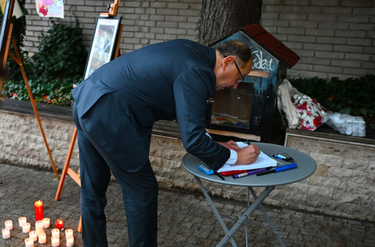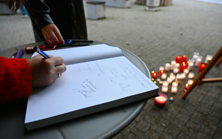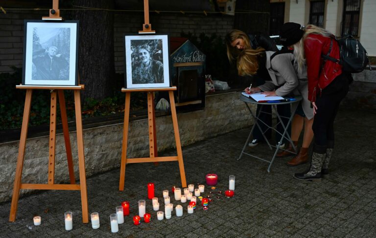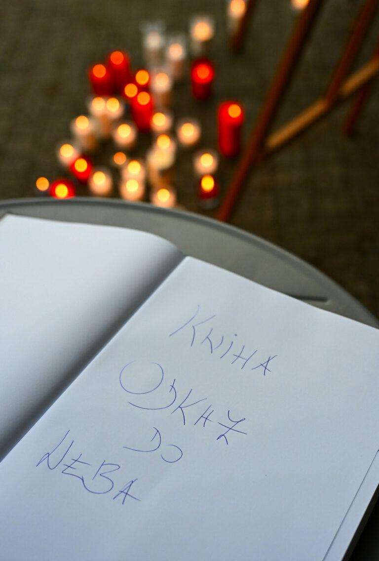 Ľudia píšu odkazy do knihy na Námestí študentov v blízkosti Gymnázia Ľudovíta Štúra v Trenčíne v rámci pietnej spomienky na druhé výročie zavraždených dvoch mladých ľudí, Juraja Vankuliča a Matúša Horvátha pod názvom Deň pestrosti. Trenčín, 11. október 2024. Foto: SITA/Tomáš Somr