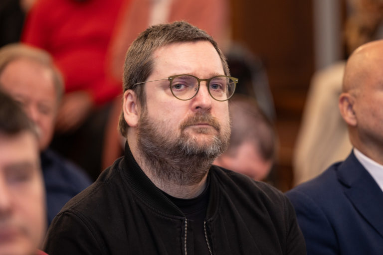 Ocenený grafický dizajnér Marcel Benčík počas podujatia Deň poštovej známky a filatelie spojeného s udeľovaním ocenení autorom najkrajších slovenských poštových známok za rok 2023. Bratislava, 18. december 2023. Foto: SITA/Jana Birošová