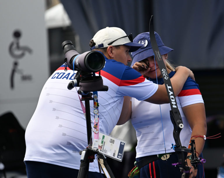 Sprava: Slovenská lukostrelkyňa Denisa Baránková a tréner Vladimír Hurban počas kvalifikácie súťaže lukostreľby žien pred začiatkom XXXIII. letných olympijských hier 2024 v Paríži. Paríž, 25. júl 2024. Foto: SITA/Martin Medňanský.