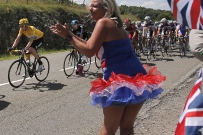 Diváci s francúzskymi vlajkami počas 10. etapy Tour de France, ktorá merala 217,5 km a viedla zo Saint Flour do Albi. 15. júl 2019. Foto: SITA/AP Photo/ Christophe Ena